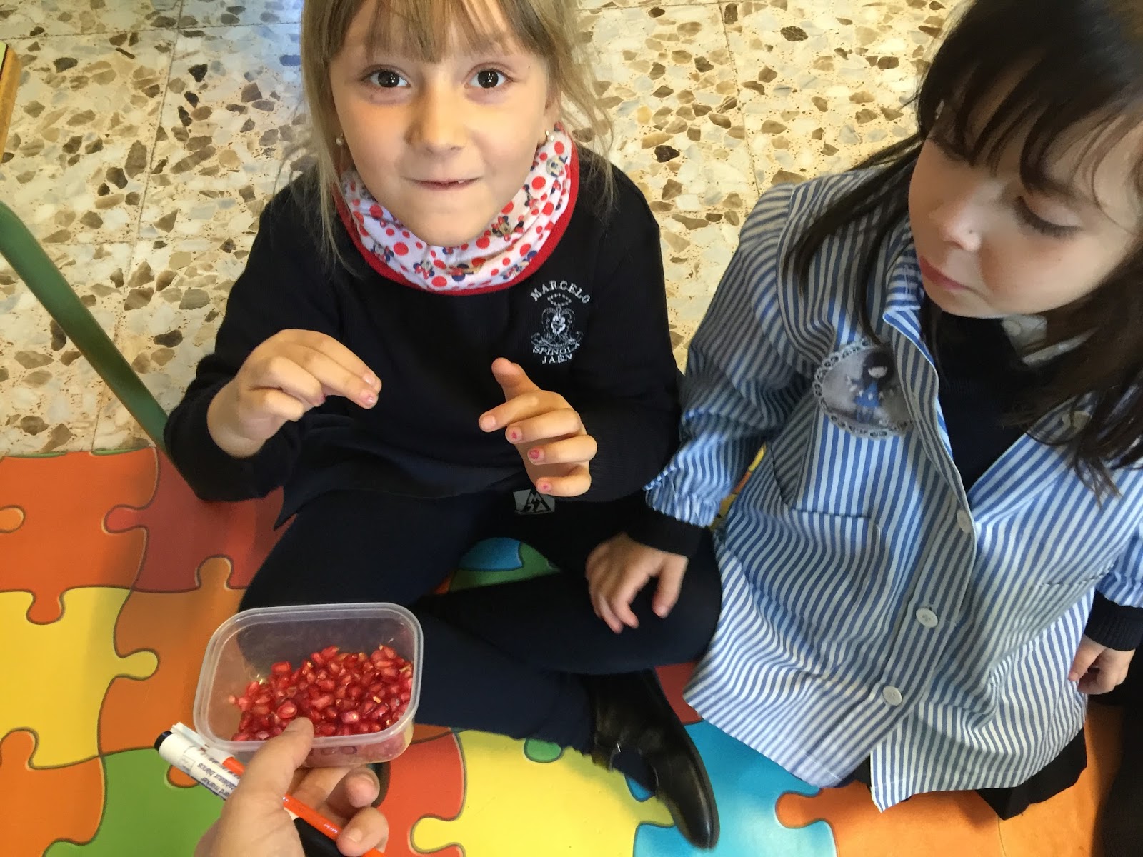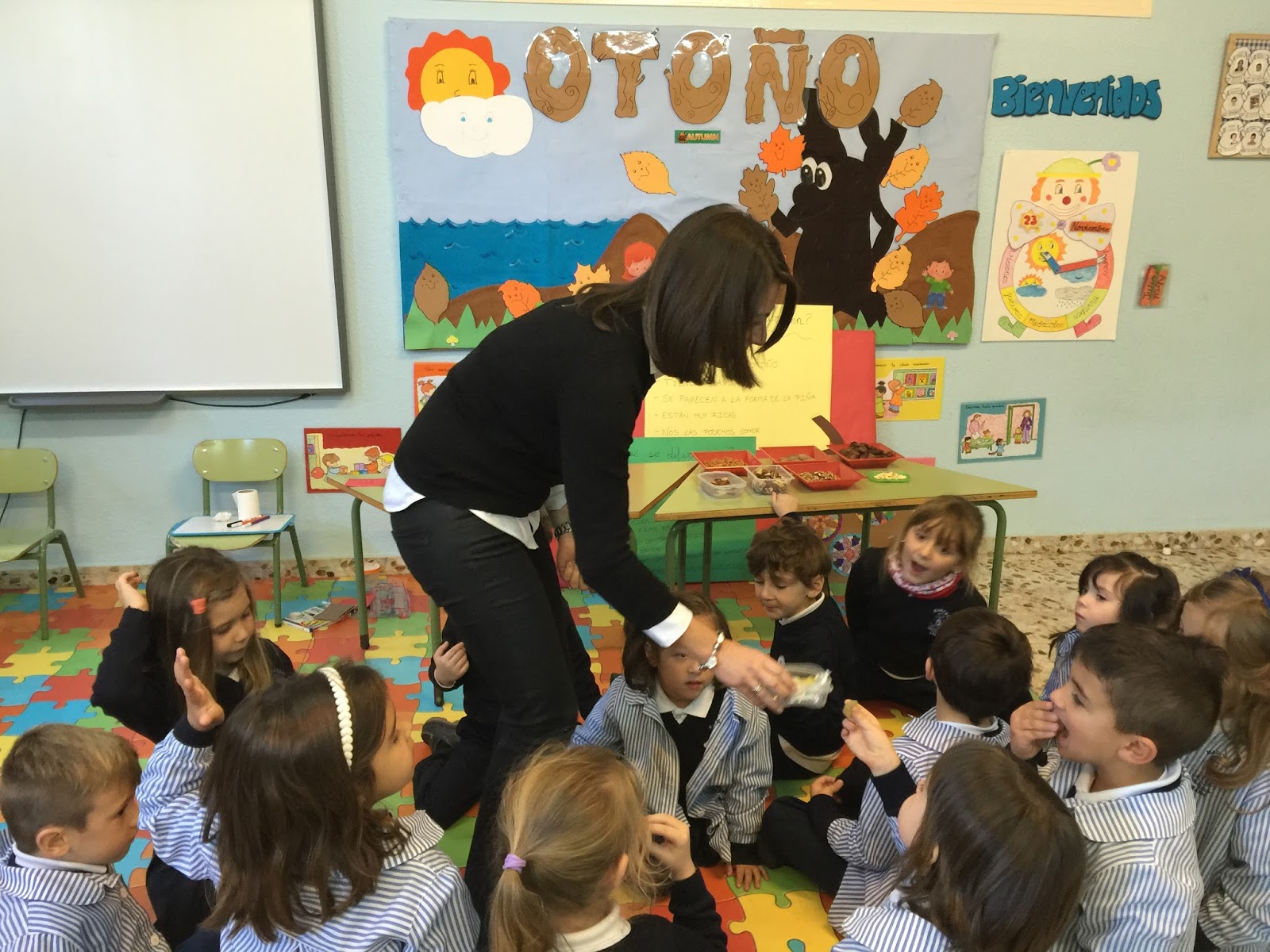 Posteriormente, la seño Lourdes y la seño Sara comenzaron a enseñar los diferenes frutos: mandarinas, uvas, granadas, cacahuetes, almendras, nueces, castañas,...